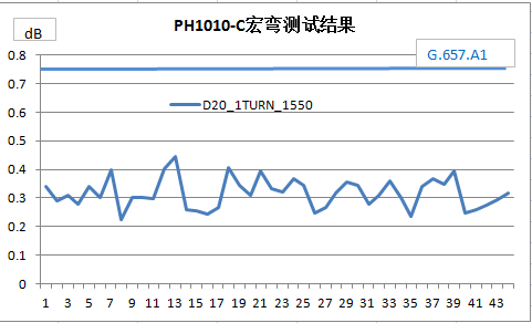 上圖是PH1010-C在φ20mm彎曲情況下,1550nm波段宏彎測試結(jié)果。可以看出,在φ20mm及以上彎曲直徑下,宏彎損耗都小于0.5dB,也遠低于G.657.A1的ITU-T所規(guī)定標準。