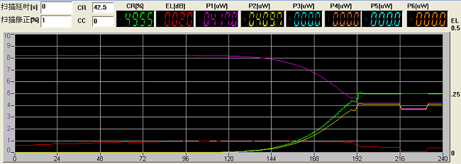 拉錐性能驗證:光纖在熔融拉伸過程中,材料缺陷和波導(dǎo)結(jié)構(gòu)變化等原因,會導(dǎo)致器件的光功率損失。該驗證就是根據(jù)器件光功率損耗的大小和器件的穩(wěn)定性直接評估該光纖是否適合制作熔融拉錐型光纖器件。下圖是PH1010-C光纖進行拉錐得到的功率/損耗曲線,記錄了光纖從開始拉伸直至光纖拉錐機停機整個過程中功率/損耗隨拉伸長度的變化(P1是光纖輸出功率,EL是附加損耗,CR是分光比)。驗證采用1310/1550nm單模泵浦光源,拉錐期間PH1010-C光纖的損耗波動很平緩,損耗始終低于0.1dB。