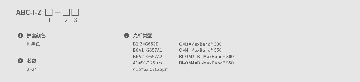 ABC-I 接入光纜的結(jié)構(gòu)是將 Φ250μm 光纖套入高模量材料制成的松套管中,松套管內(nèi)填充 防水材料。松套管外包覆一層玻璃纖維加強(qiáng)元件,最外擠制一層低煙無(wú)鹵材料(LSZH,低煙、 無(wú)鹵、阻燃)護(hù)套而成。