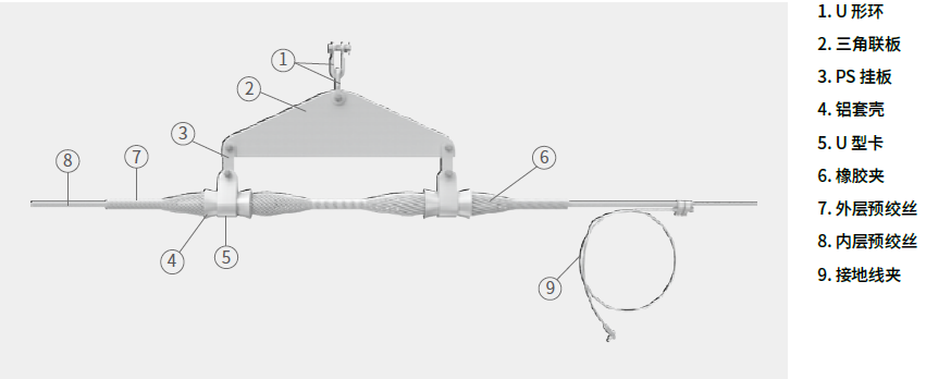 • OPGW 預絞式懸垂線夾依線路跨距、落差及張力的大小分雙層預絞絲單懸掛點懸垂線夾(簡稱單懸垂線夾)、雙層預絞絲雙懸掛點懸垂線夾(簡稱雙懸垂線夾)。