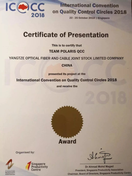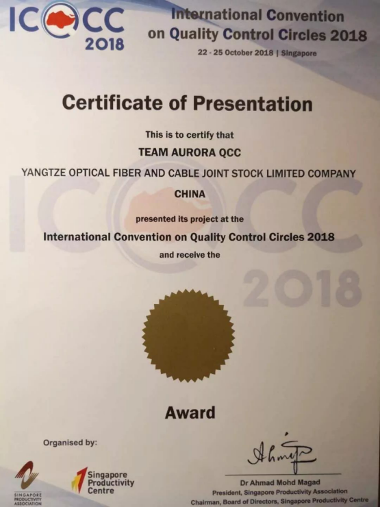 長飛公司每年開展群眾性的質(zhì)量改進活動,在集團范圍內(nèi)開展QC發(fā)表賽,以及組織參加外部的QC發(fā)表賽,與其他優(yōu)秀企業(yè)的QC小組交流切磋。2014年,長飛公司開始參加國際質(zhì)量管理小組大會;2014年到2016年每年斬獲一枚金獎;2017年加大參與力度,榮獲兩項國際QC金獎;2018年再接再厲,又獲兩項國際QC金獎。