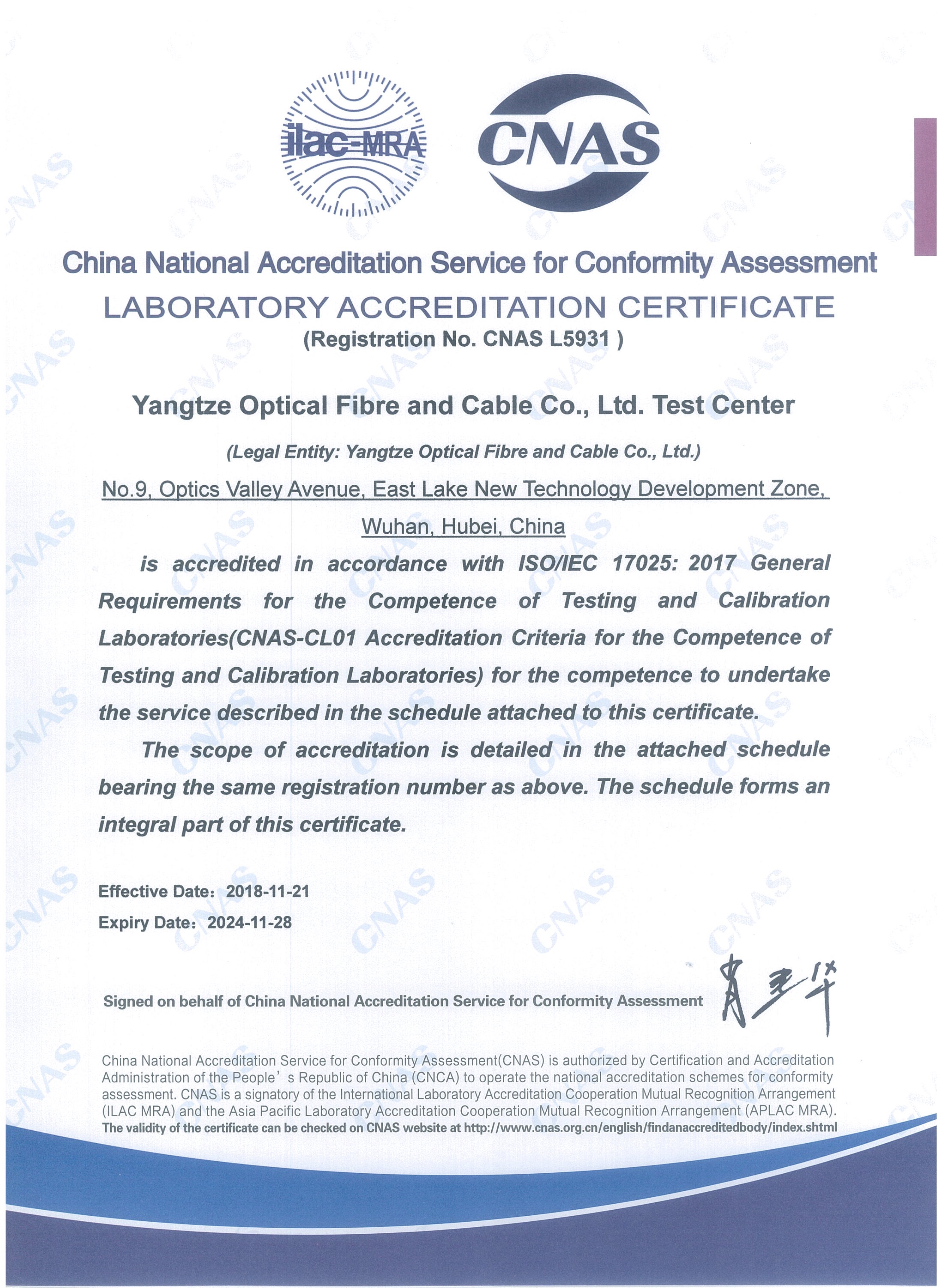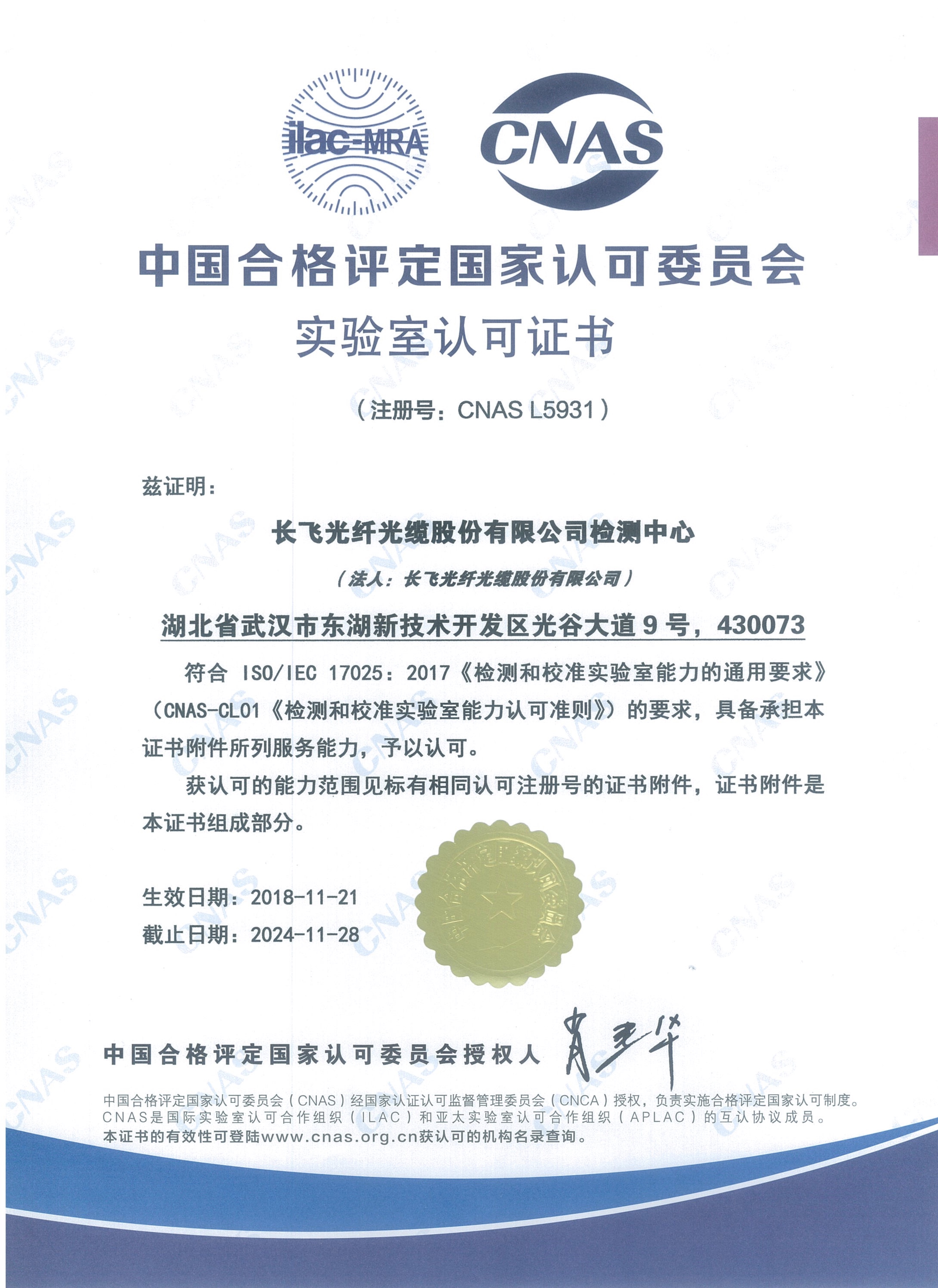 近日,中國合格評定國家認可委員會(CNAS)組織評審專家組成員,對長飛公司檢測實驗室進行了實驗室擴項換證復審的現場評審工作。繼2012年首次通過CNAS認可后,歷經6年的體系運行與持續改進,在ISO/IEC 17025:2017標準發布不到一年內,長飛公司檢測實驗室再次一次性通過CNAS認證,并獲新認可證書。