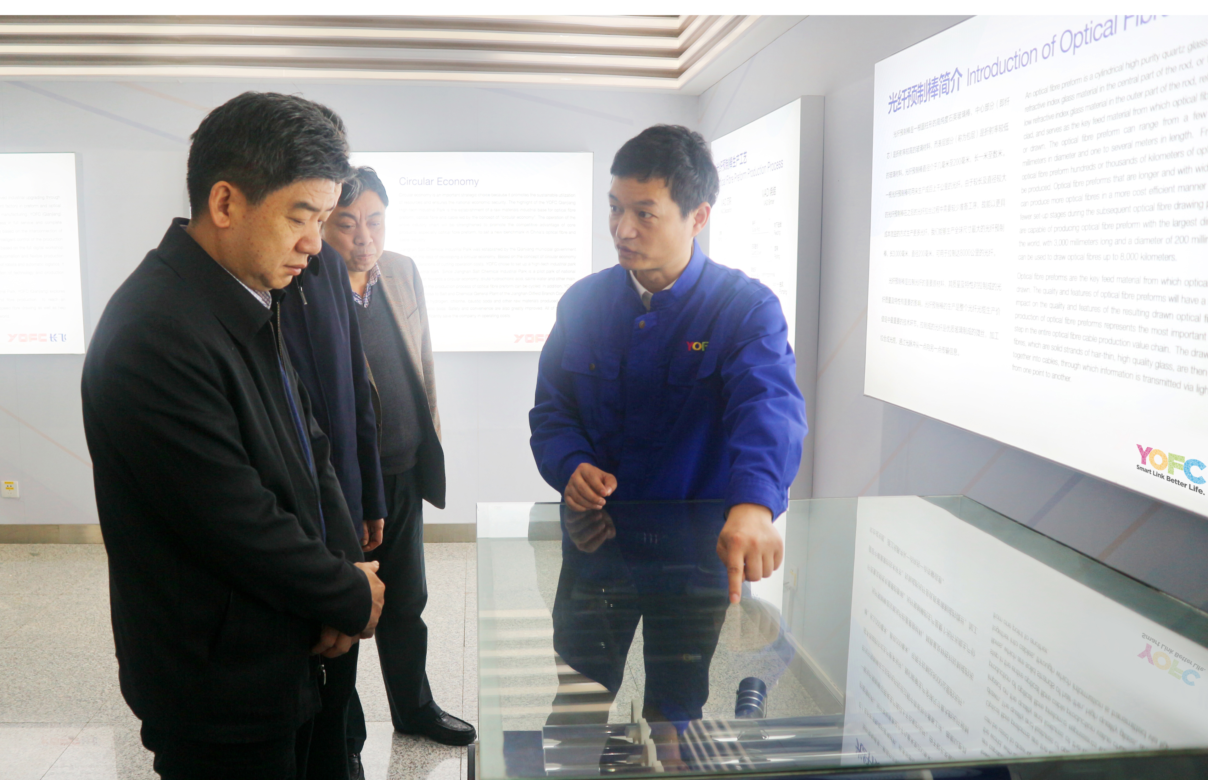在長飛光纖潛江公司展廳,錢新偉介紹了長飛公司及長飛光纖潛江公司近年來的發展現狀。長飛公司堅持創新驅動發展,已建成了全球首個預制棒和光纖智能制造工廠,目前,長飛光纖潛江公司已連續完成兩期投產。傅主任詢問了長飛光纖潛江公司投產情況,對公司取得的成績給予了高度認可,并重點查看了車間里的設備安裝和調試狀況,寄語公司加大創新力度,夯實產業基礎,帶動地方經濟發展。