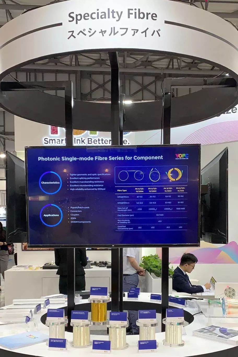 本次展會上,針對5G高傳輸速率、高帶寬、低時延的傳輸需求,長飛公司重點展出5G高速器件用的器件型單模光纖、耦合光纖、器件型保偏光纖、彎曲不敏感單模光纖等產品;針對數據中心短距傳輸,展出能夠實現低串擾空分復用光信號傳輸的多芯光纖及配套扇入扇出模塊、基于模分復用的少模光纖。值得關注的是,長飛公司還利用動態高清4K數字電視向觀眾展示少模光纖,為客戶帶來更為直觀、生動的產品體驗。