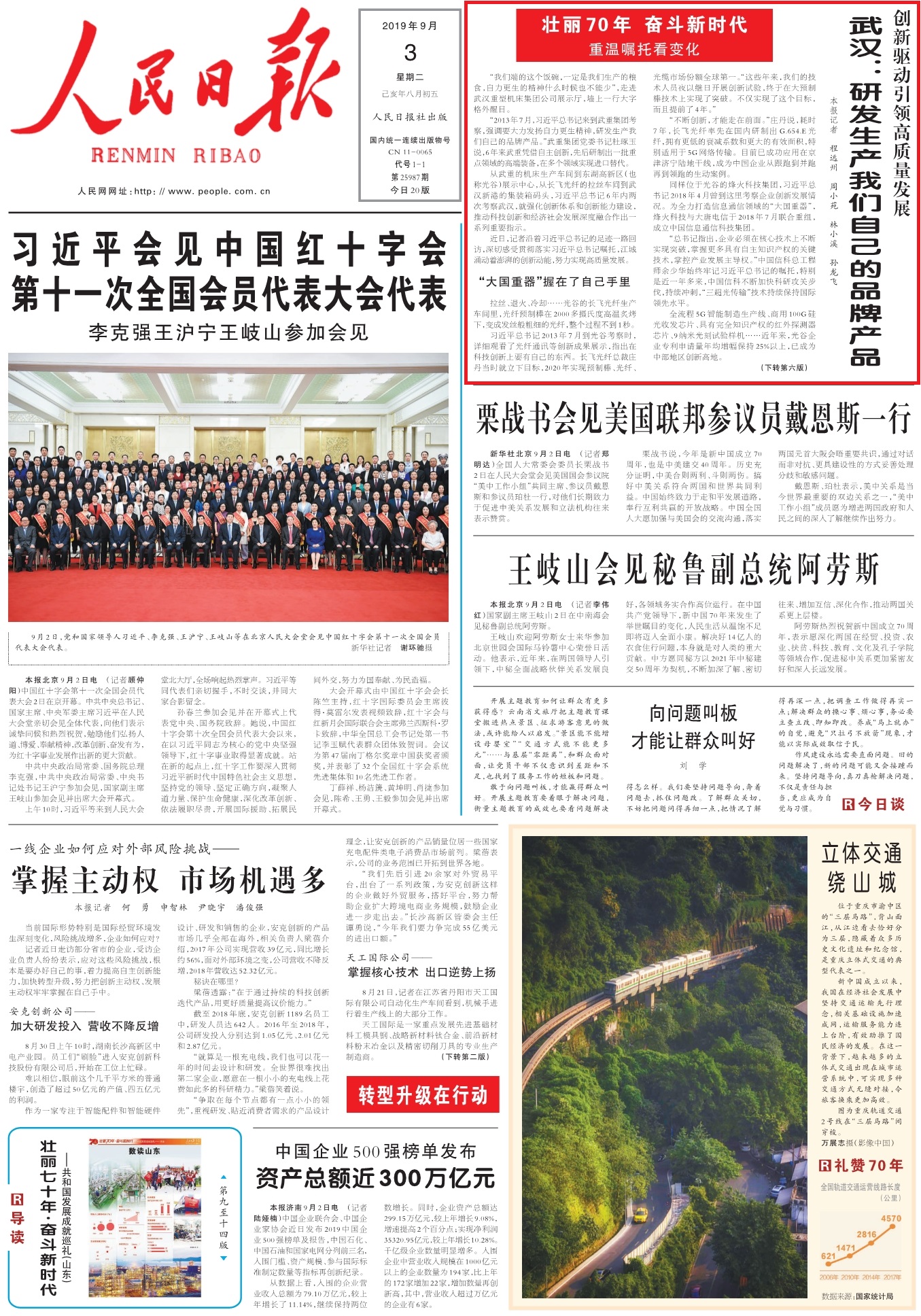 9月3日,《人民日報》頭版報眼刊發《創新驅動引領高質量發展——武漢:研發生產我們自己的品牌產品(壯麗70年 奮斗新時代·重溫囑托看變化)》,長飛光纖光纜股份有限公司(以下簡稱“長飛公司”,股票代碼:601869.SH、06869.HK)作為習總書記6年內兩次視察的重點企業,牢記習總書記囑托,將“大國重器”牢牢掌握在自己手里,實現高質量發展。