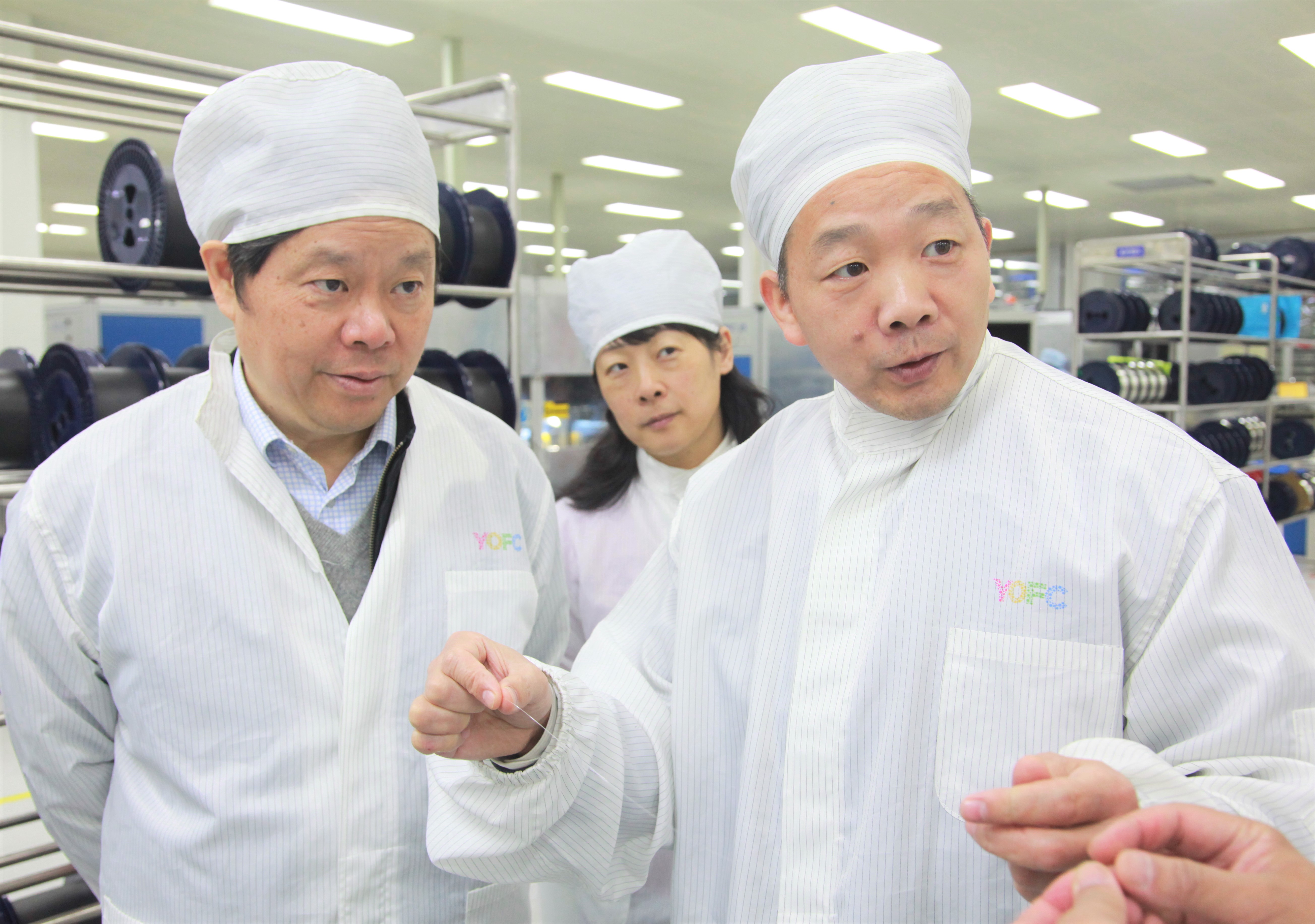 參觀車間時,劉德富一行重點了解了光纖預制棒、光纖產品的主要生產工藝過程。劉德富高度評價長飛公司,對公司全系統完整的設備及技術的自主開發、解決能力和輸出能力表示肯定和贊賞。