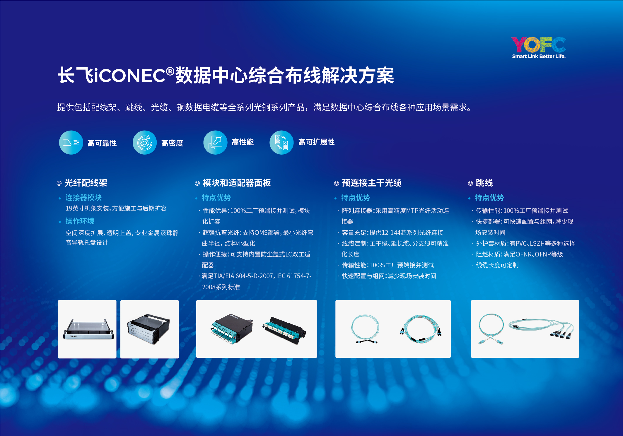 長飛公司iCONEC®布線產品已經大量用于國內大型數據中心,具有高可靠性、高密度、高性能、高可擴展性等特點。今年9月,長飛公司發布新一代超高密度配線架,為數據中心的高密度布署提供了新的解決方案。