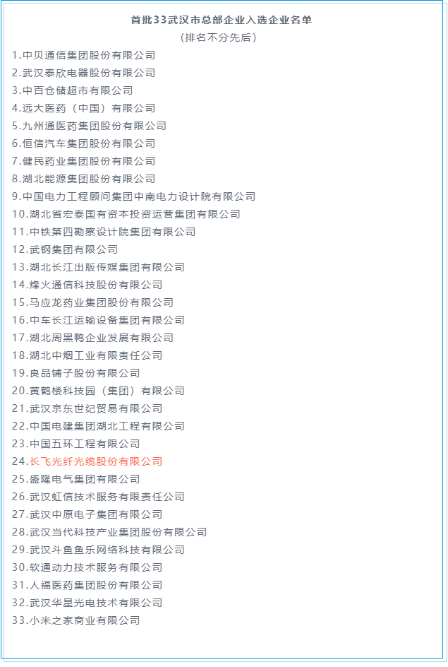 近日,長飛光纖光纜股份有限公司(以下簡稱“長飛公司”,股票代碼:601869.SH、06869.HK)入選武漢市首批總部企業名單,這是武漢市首次認定總部企業。