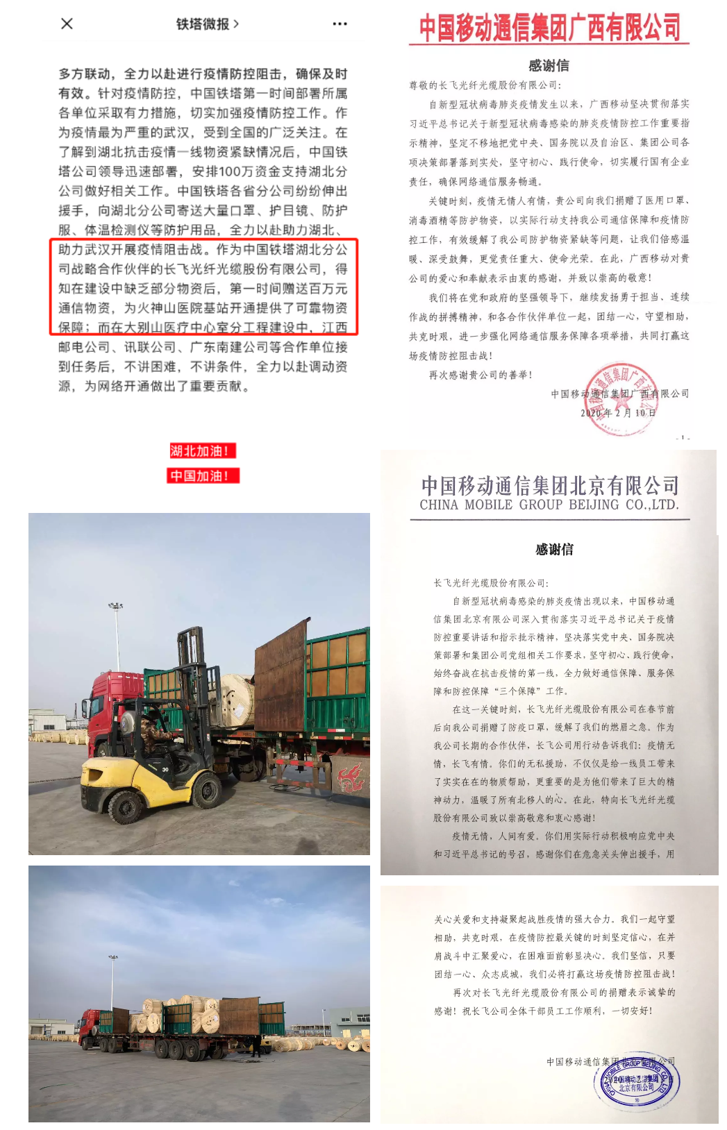 為有效遏制新冠肺炎疫情,信息通信企業全力做好通信保障、服務保障和防控保障工作,在這關鍵時刻,長飛公司雖處疫區中心,但是依然心系客戶,想客戶之所想,急客戶之所急,向中國鐵塔湖北分公司捐贈百萬元通信物資,為火神山醫院基站開通提供可靠的物資保障;長飛公司分公司及辦事處向中國移動通信集團北京有限公司、中國移動通信集團廣西有限公司捐贈口罩等防護物資,以實際行動支持運營商通信保障和疫情防控工作;長飛蘭州于2月8日通過當地政府審批正式復工,生產的第一批光纜于2月14日裝車發往北京,保障當下通信網絡建設。