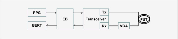 采用商用的多模和單模光模塊,測(cè)試單多模通用型光纖的傳輸性能。脈沖模式發(fā)生器(PPG)生成速率為25.78Gb/s的 215-1偽隨機(jī)二進(jìn)制序列(PRBS),并通過(guò)評(píng)估板(EB)調(diào)制光模塊。采用可變光衰減(VOA)來(lái)調(diào)節(jié)收發(fā)器的接收光功率,輸出的電信號(hào)由誤碼儀(BERT)檢測(cè),如圖3所示。