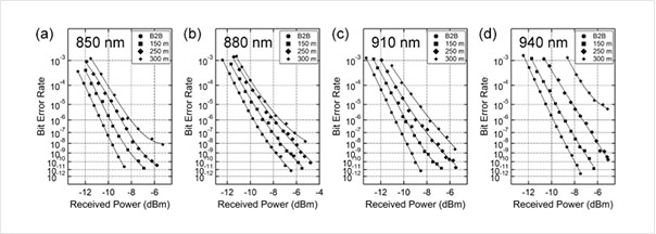 采用Finisar的100G SWDM4多模光模塊,測(cè)試光纖的多模傳輸性能,誤碼率曲線如圖4所示。對(duì)于短波長(zhǎng)波分復(fù)用的四個(gè)波長(zhǎng),300m鏈路傳輸?shù)恼`碼率低于IEEE 802.3標(biāo)準(zhǔn)建議的FEC極限(5×10-5),表明單多模通用型光纖在850nm~950nm的波段可以傳輸300m。