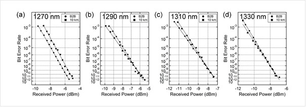 采用商用的100G CWDM4單模光模塊,測(cè)試光纖的單模傳輸性能,誤碼率曲線如圖5所示。在1270nm~1330nm的工作波長(zhǎng)范圍內(nèi),單多模通用型光纖可以實(shí)現(xiàn)10km的無(wú)誤碼(10-12)單模傳輸。