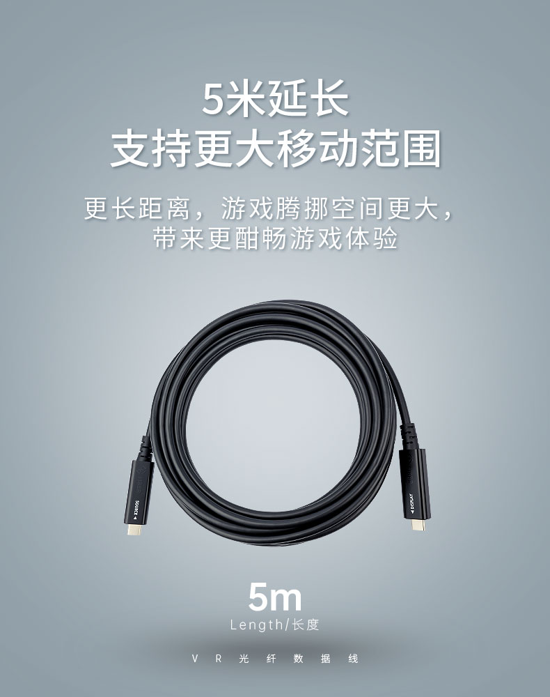 這款VR光纖數(shù)據(jù)線長(zhǎng)達(dá)5米,采用長(zhǎng)飛公司特種抗彎光纖,線材輕柔細(xì)軟,連接VR眼鏡后,使得人體動(dòng)作不受束縛,可提供更大的移動(dòng)空間,真正讓受眾享有自由輕松的沉浸式體驗(yàn)。同時(shí),線材的光纖材料不產(chǎn)生電磁干擾,其極低的信號(hào)衰減率,使觀影大片畫(huà)質(zhì)清晰、流暢穩(wěn)定,使游戲視頻幾乎無(wú)卡頓,相較銅線傳輸信號(hào)更穩(wěn)定、更完整。