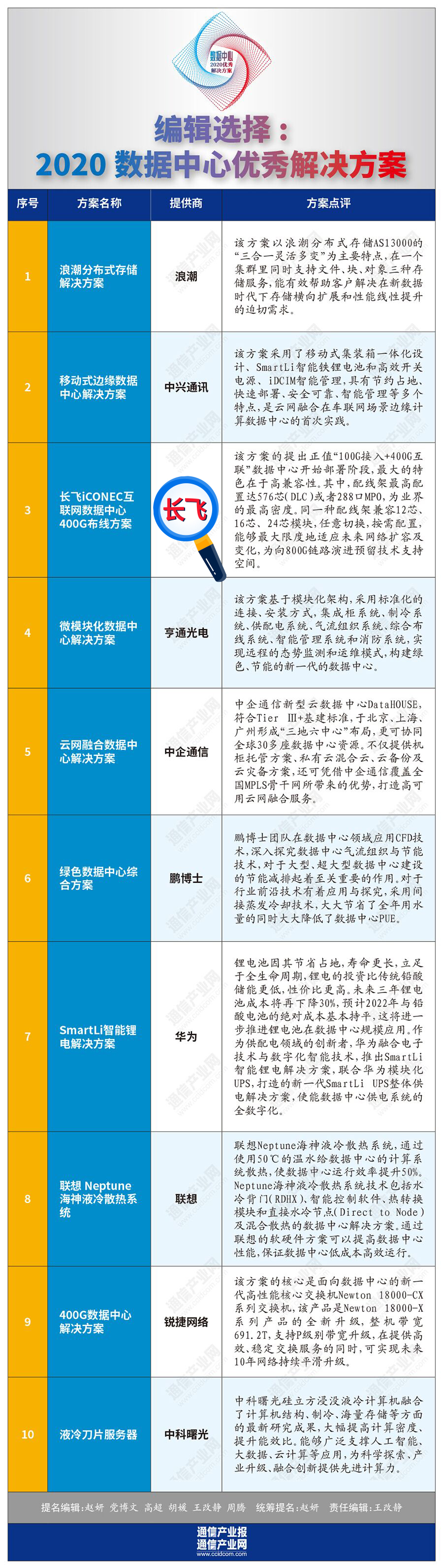3月4日召開的中共中央政治局常務委員會會議明確提出,要加快5G網絡、數據中心等新型基礎設施建設進度。這是近年來,數據中心首次被列入基礎建設條目,將給數據中心的建設規模、市場以及技術創新帶來新的變化,數據中心正成為經濟的新“底座”。《通信產業報》全媒體依據技術創新能力、市場領導力、發展潛力和環境友好度四大維度評價體系,評出2020新基建數據中心先鋒榜核心設備TOP20,同時還就優秀解決方案做出推薦。