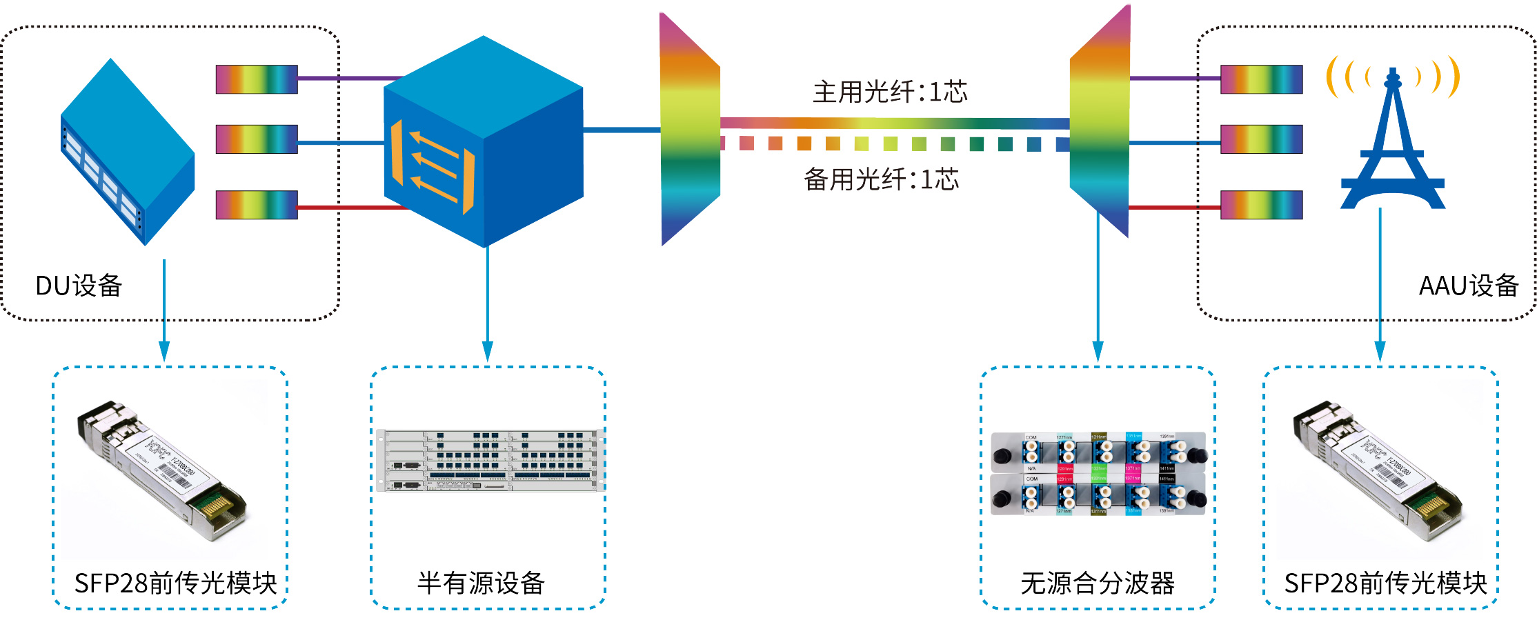 基于在通信領域持續深耕和多年光網絡領域的經驗積累,長飛光纖光纜股份有限公司(以下簡稱“長飛公司”)研發了半有源波分C/M/LWDM系列產品:局端采用有源,遠端采用無源,便于部署和維護,既能極大緩解光纖資源的壓力,又能兼顧成本、管理和保護優勢,助力運營商快速、低成本建設5G前傳網絡。