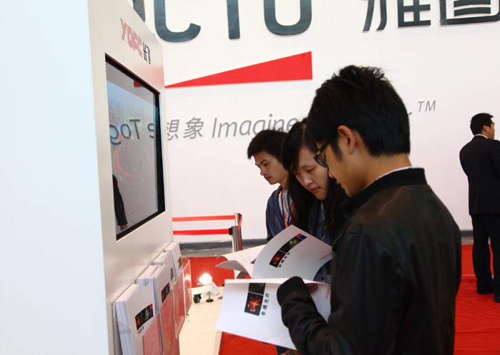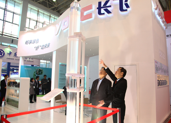 本次展會,長飛公司展臺面積為54平米,以白色為主色調,細膩精致的烤漆,典雅大氣的空間布局,充滿了現代感和科技氣息。長飛展出的長3m、直徑200mm的大尺寸預制棒,配合燈光效果,預制棒顯得晶瑩剔透,形如一飛沖天的火箭發射臺,形象地展示了長飛在光纖預制棒領域的技術優勢和行業地位。預制棒的展出成為全場的亮點,吸引了大批觀眾駐足參觀,他們紛紛與預制棒合影留念。