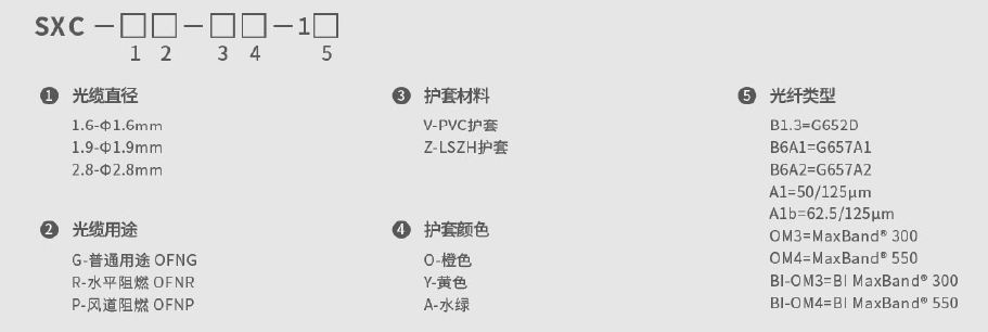 SXC 單芯光纜使用單根Φ900μm 或Φ600μm 緊套光纖作為光傳輸介質(zhì),外覆一層芳綸作為受力加強(qiáng)單元,最外擠制一層聚氯乙烯(PVC)或低煙無鹵材料(LSZH,低煙、無鹵、阻燃)護(hù)套而成。